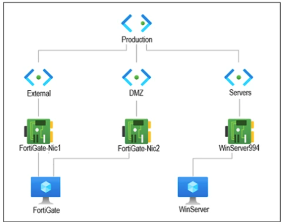 One VM is a FortiGate that has one interface in the DMZ subnet, which is in the Production VNet. The other VM is a Windows Server in the Servers subnet, which is also in the Production VNet. You cannot ping the Windows Server from the FortiGate VM.
